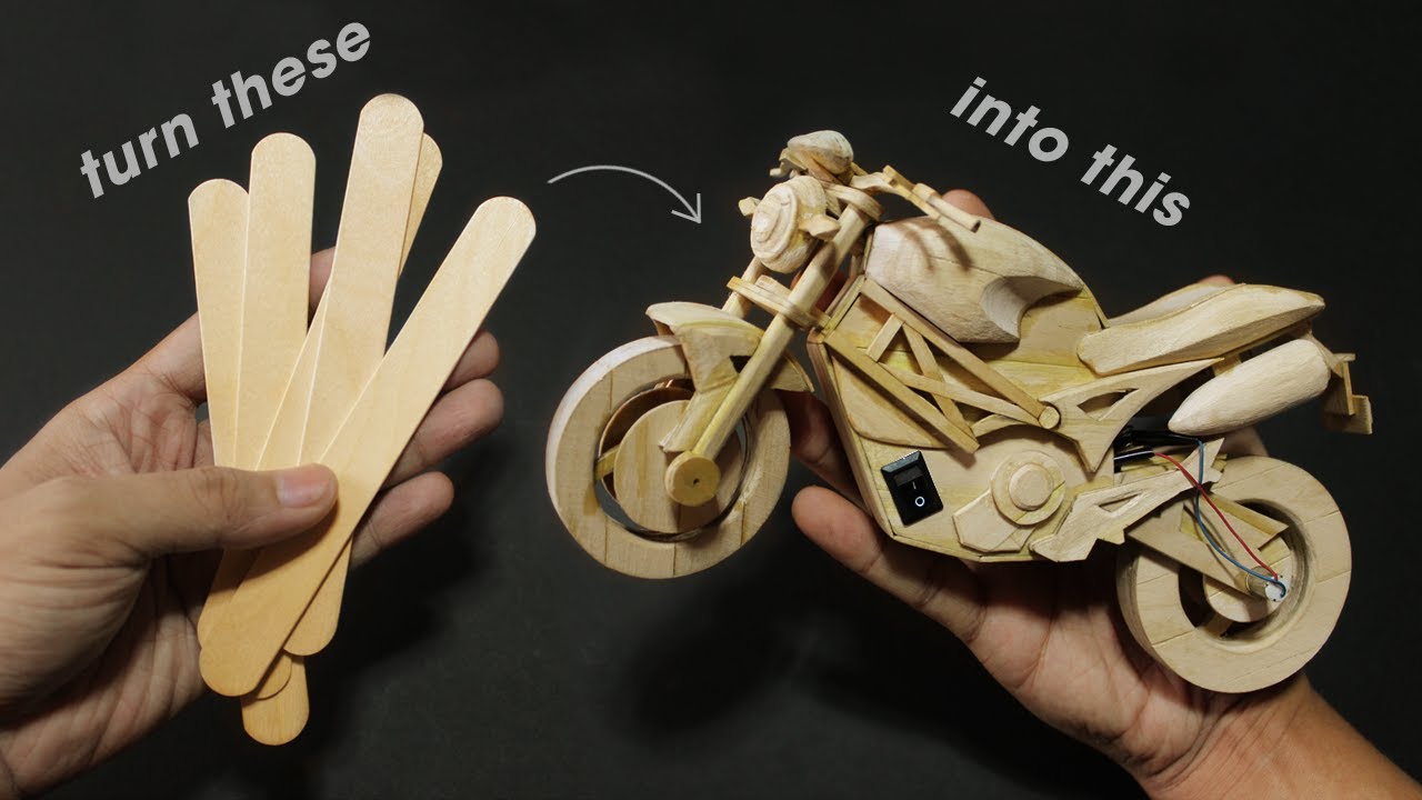 مثلا اگر به موتور یا ماشین های جذاب علاقه دارید، چرا کاردستی با چوب بستنی یا چوب یک ماکت ماشین خودرو یا موتور سیکلت نمی سازید تا با آن جلوه اتاق و منزل خودتان را تزئین کنید.